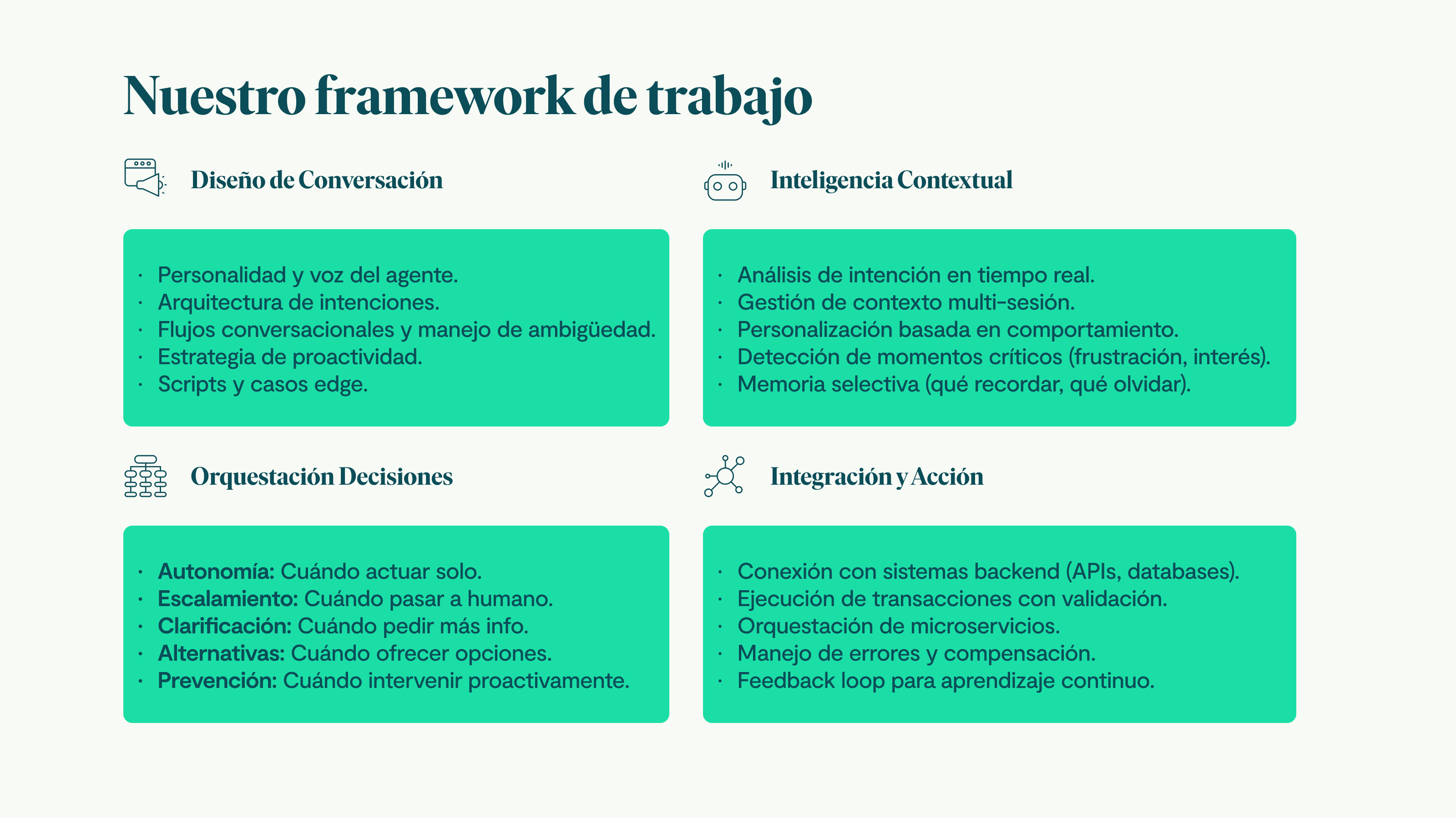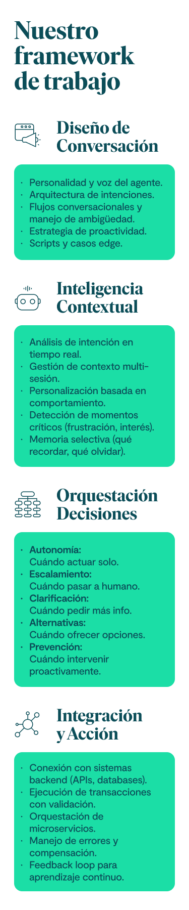 Implementamos sistemas que adaptan contenido, tono y flujo a cada usuario según su intención y contexto y que integran la experiencia conversacional en el mismo site. - Orquestar ecosistemas de agentes, humanos y sistemas